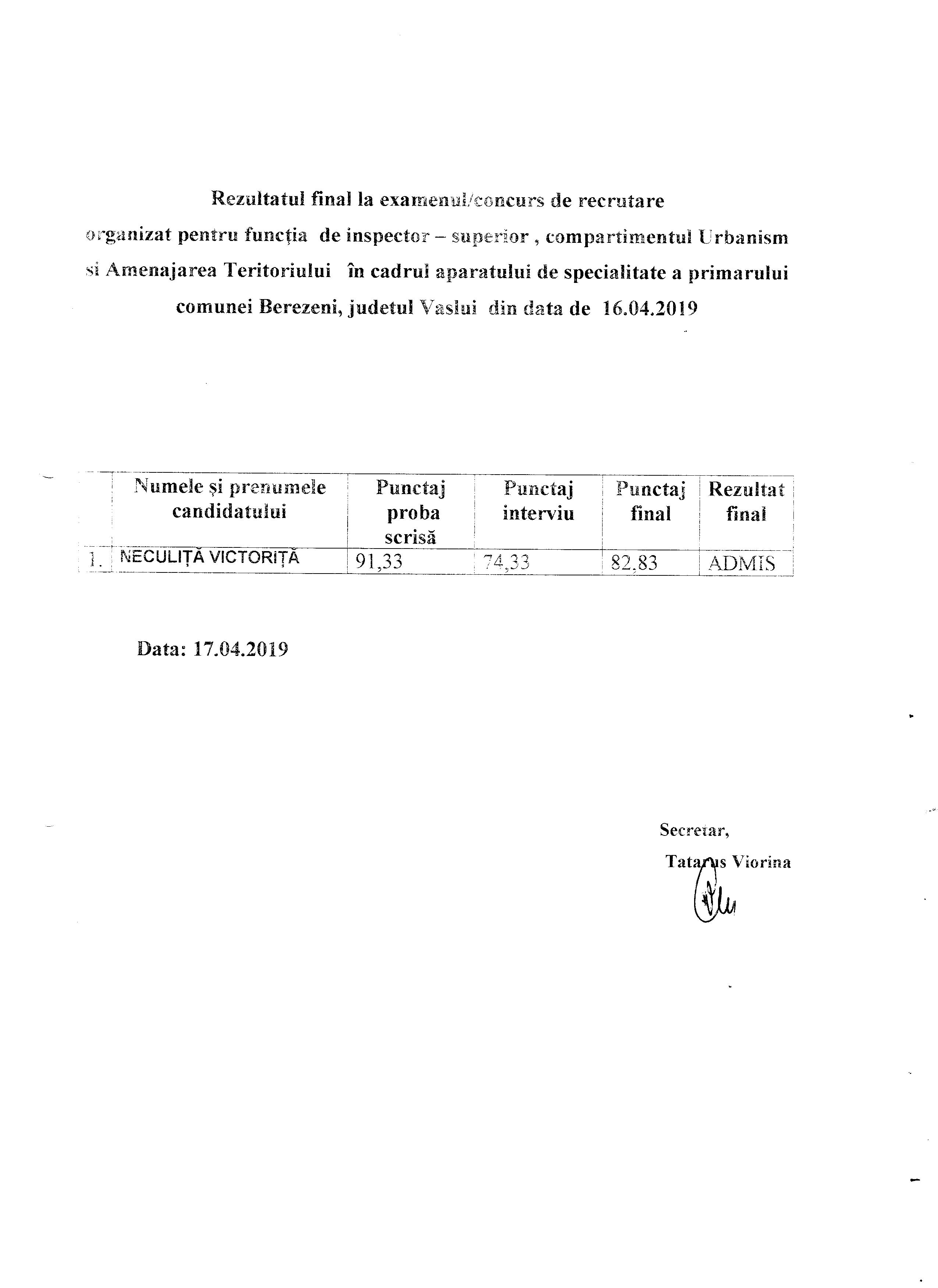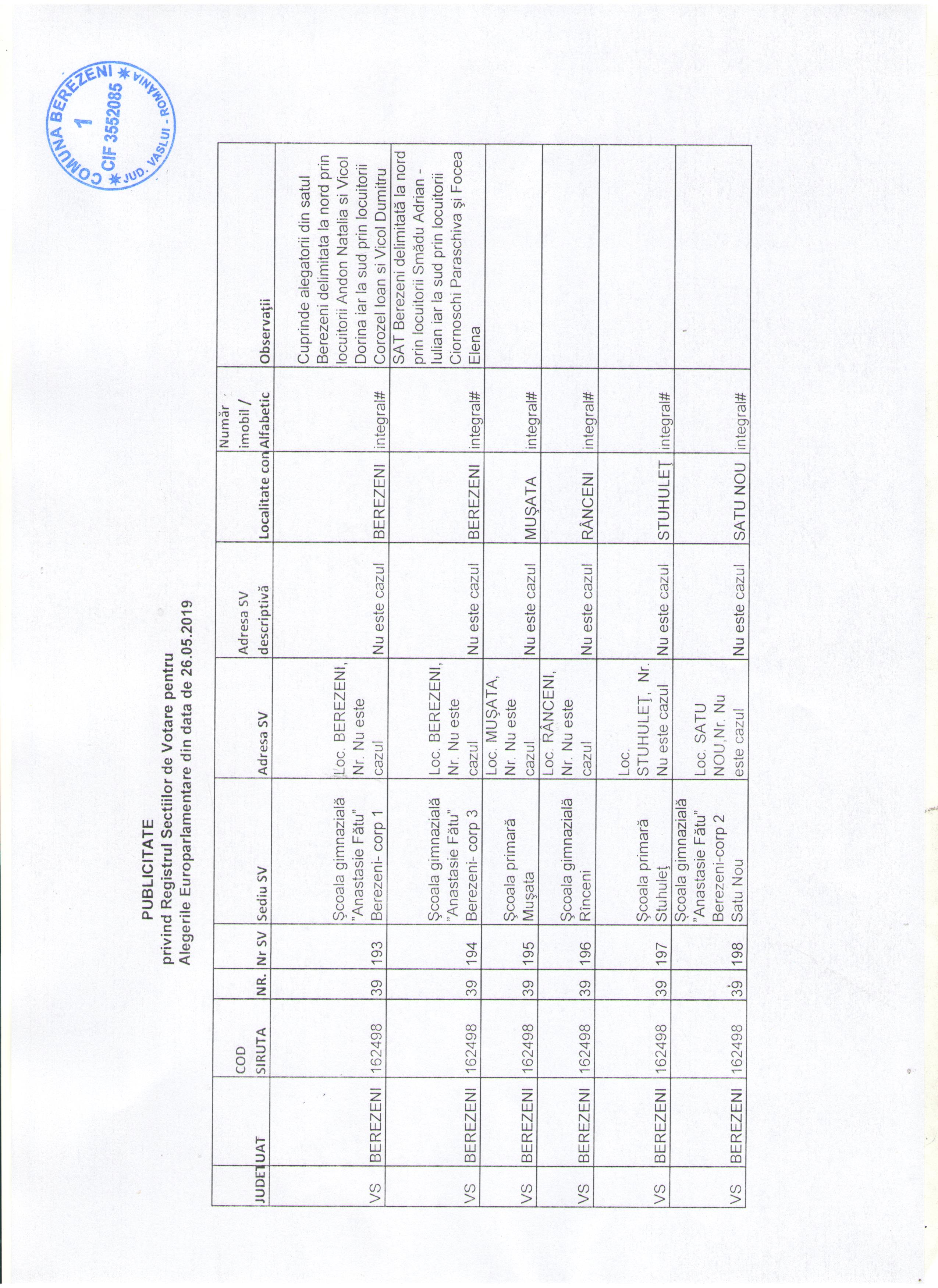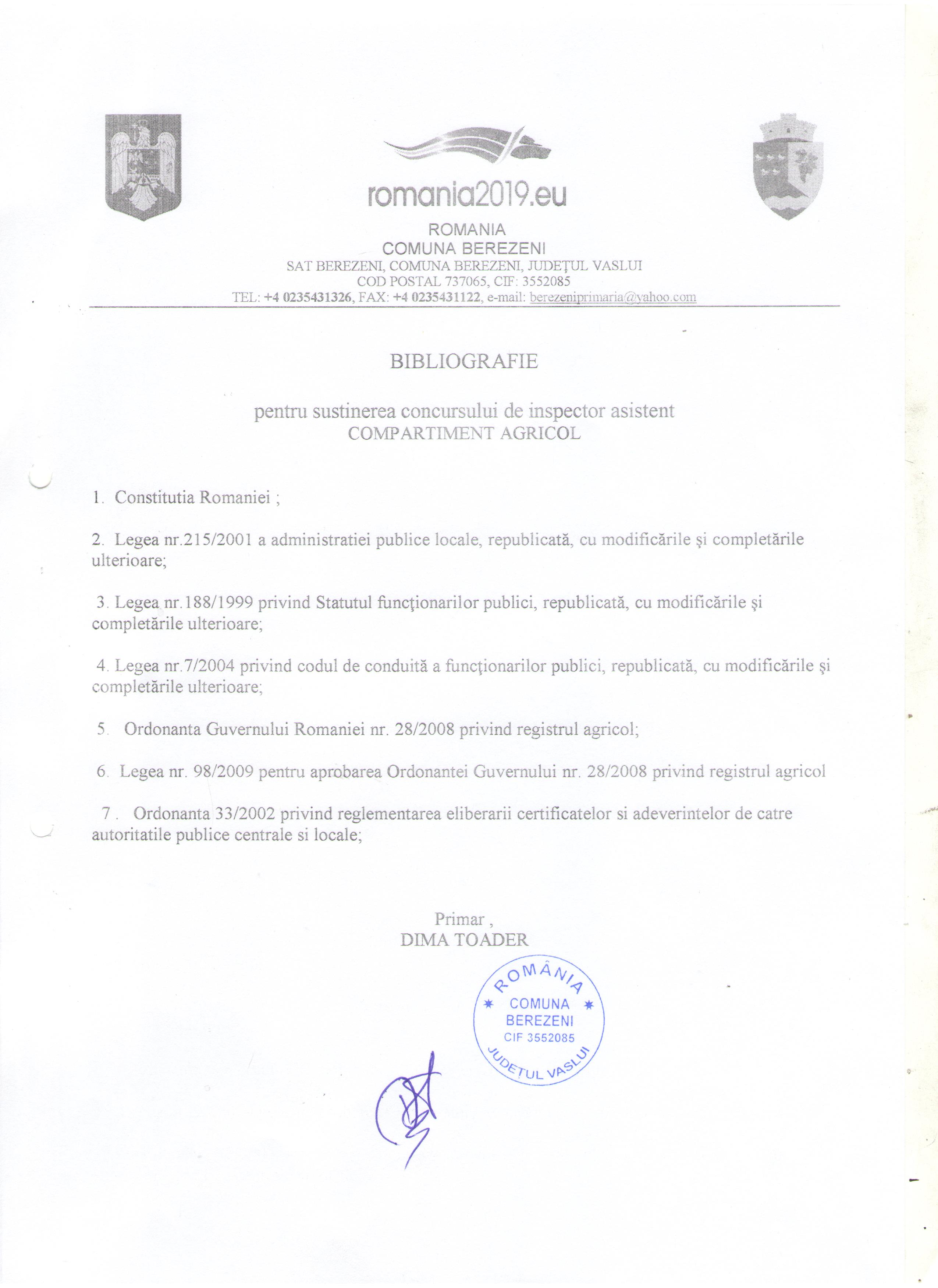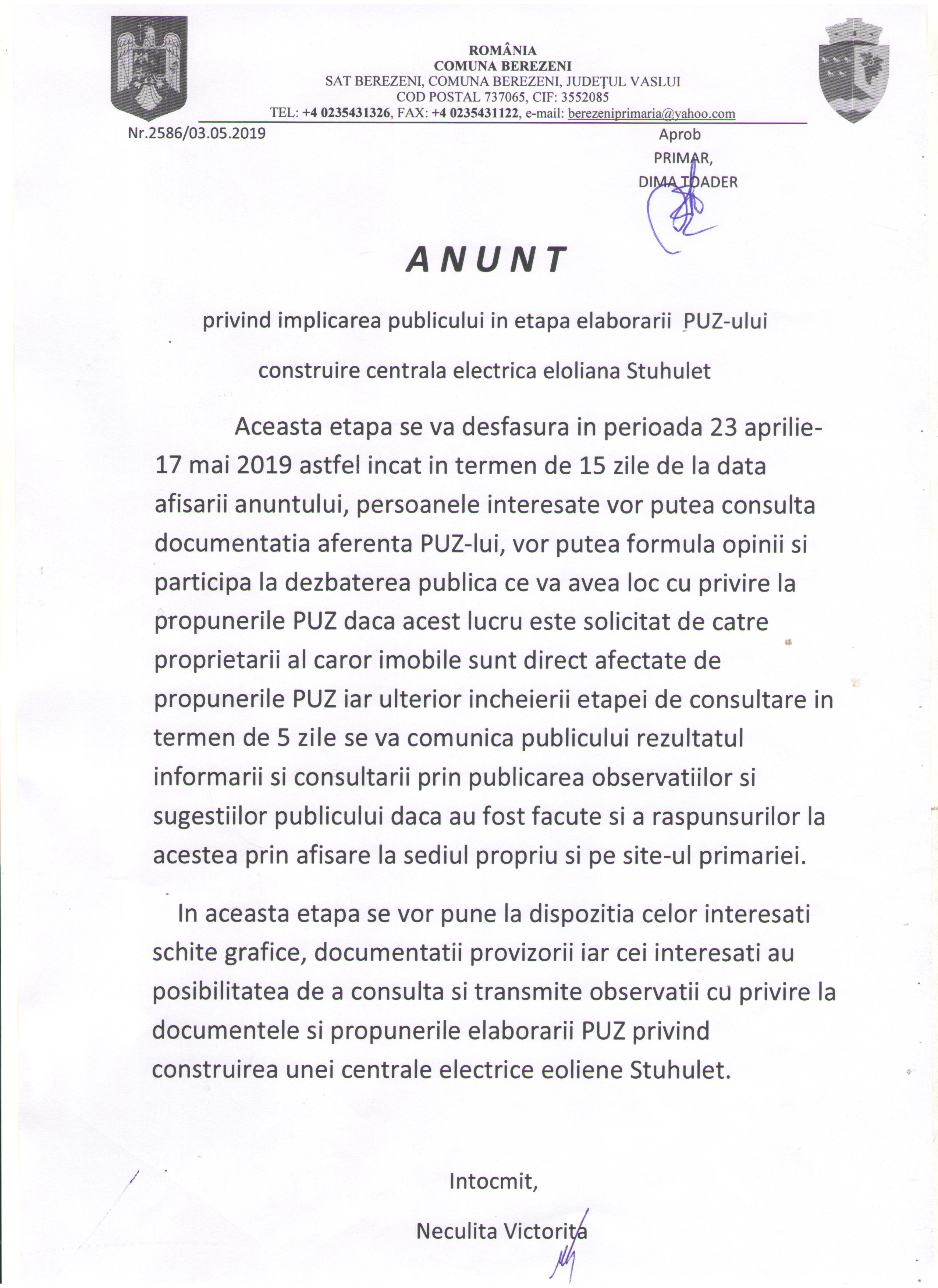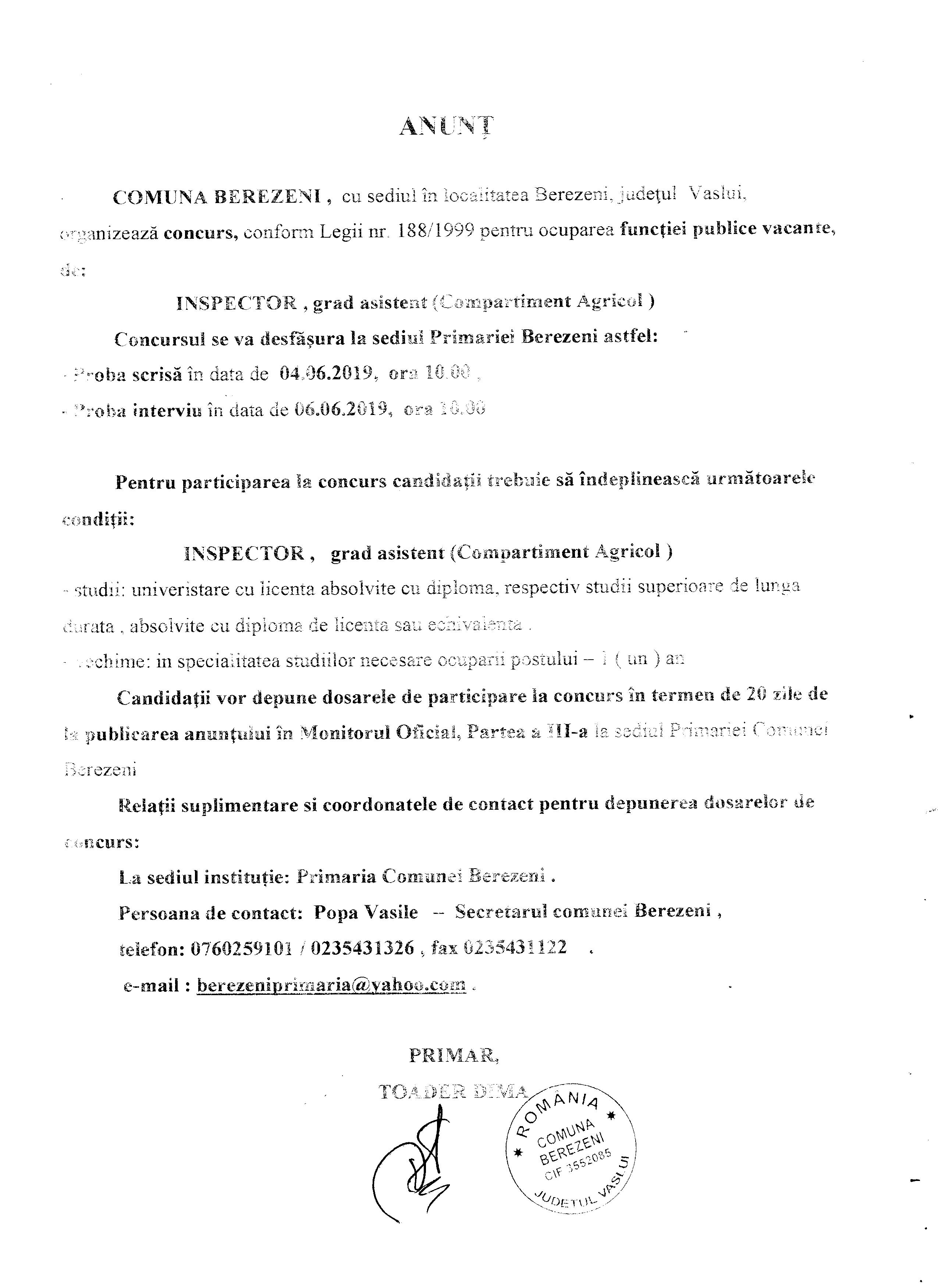 30 iulie 2025 - In Fără categorie By admin Comment off Anunțuri publice Download selected Selectare Toggle Titlu Dată pdf Concurs laborant operator tratarea apei ( pdf, 881 KB ) (513 descărcate) 23 dec. 2019 pdf ANUNT DE PARTICIPARE LA LICITAȚIE PUBLICĂ ( pdf, 112 KB ) (566 descărcate) 21 nov. 2019 pdf Anunt concurs promovare in grad profesional ( pdf, 296 KB ) (392 descărcate) 08 nov. 2019 Imagine Rezultat final examen concurs inspector ( jpg, 454 KB ) (723 descărcate) 05 iun. 2019 Imagine Anunt elaborare PUZ centrala eoliana Stuhulet ( jpg, 744 KB ) (615 descărcate) 22 mai 2019 Imagine Bibliografie concurs inspector ( jpg, 455 KB ) (610 descărcate) 06 mai 2019 Imagine Anunt concurs inspector ( jpg, 644 KB ) (702 descărcate) 02 mai 2019 Imagine Publicatie privind reg sectiilor de votare alegeri europarlamentare 2019 ( jpg, 921 KB ) (511 descărcate) 25 apr. 2019 Imagine Rezultat final concurs ( jpeg, 349 KB ) (541 descărcate) 17 apr. 2019 pdf Rezultat concurs interviu ( pdf, 73 KB ) (418 descărcate) 16 apr. 2019 pdf AFIS PUZ COMPLETAT ( pdf, 596 KB ) (557 descărcate) 09 apr. 2019 pdf Proces Verbal selectie dosare Burse de merit Semestrul I Anul scolar 2018 2019 ( pdf, 221 KB ) (665 descărcate) 27 mart. 2019 Imagine Concurs inspector ( jpg, 629 KB ) (600 descărcate) 18 mart. 2019 Imagine Informatii furnizate de C E de Statele membre cu privire la continutul Regulamentul 2016 1191 ( jpg, 677 KB ) (591 descărcate) 15 mart. 2019 pdf Anunt Licitatie Teren Extravilan 1 ( pdf, 51 KB ) (492 descărcate) 27 aug. 2018 pdf Anunt Licitatie Teren Extravilan 2 ( pdf, 51 KB ) (535 descărcate) 27 aug. 2018 pdf Anunt Licitatie Teren Extravilan 3 ( pdf, 51 KB ) (476 descărcate) 27 aug. 2018 pdf Anunt colectiv ( pdf, 1.65 MB ) (671 descărcate) 03 aug. 2018 pdf Anunt concurs promovare ( pdf, 352 KB ) (469 descărcate) 22 iun. 2018 pdf Anunt concurs inspector grad asistent ( pdf, 87 KB ) (526 descărcate) 20 apr. 2018 «123456» Next Anunțuri Urbanism