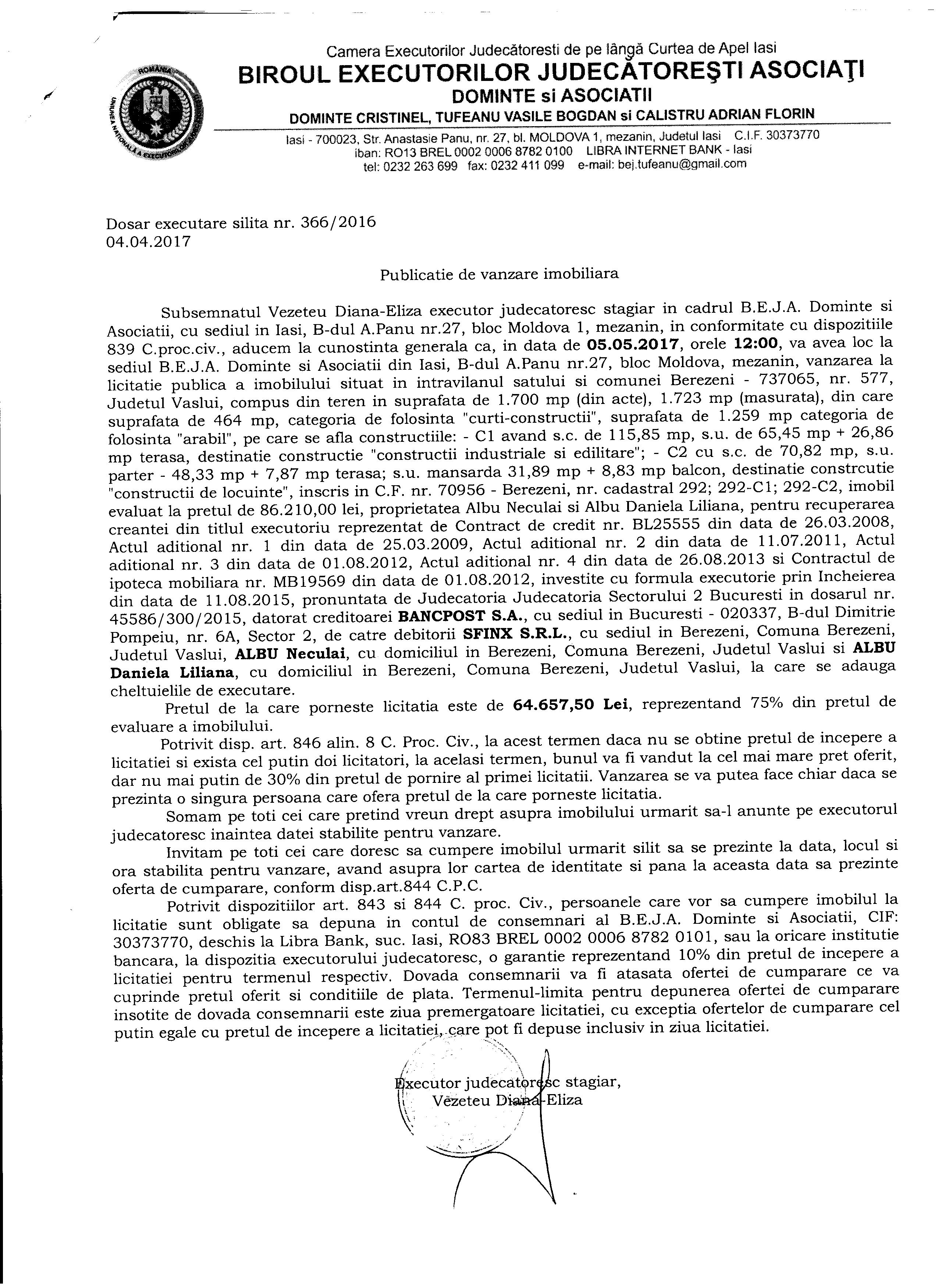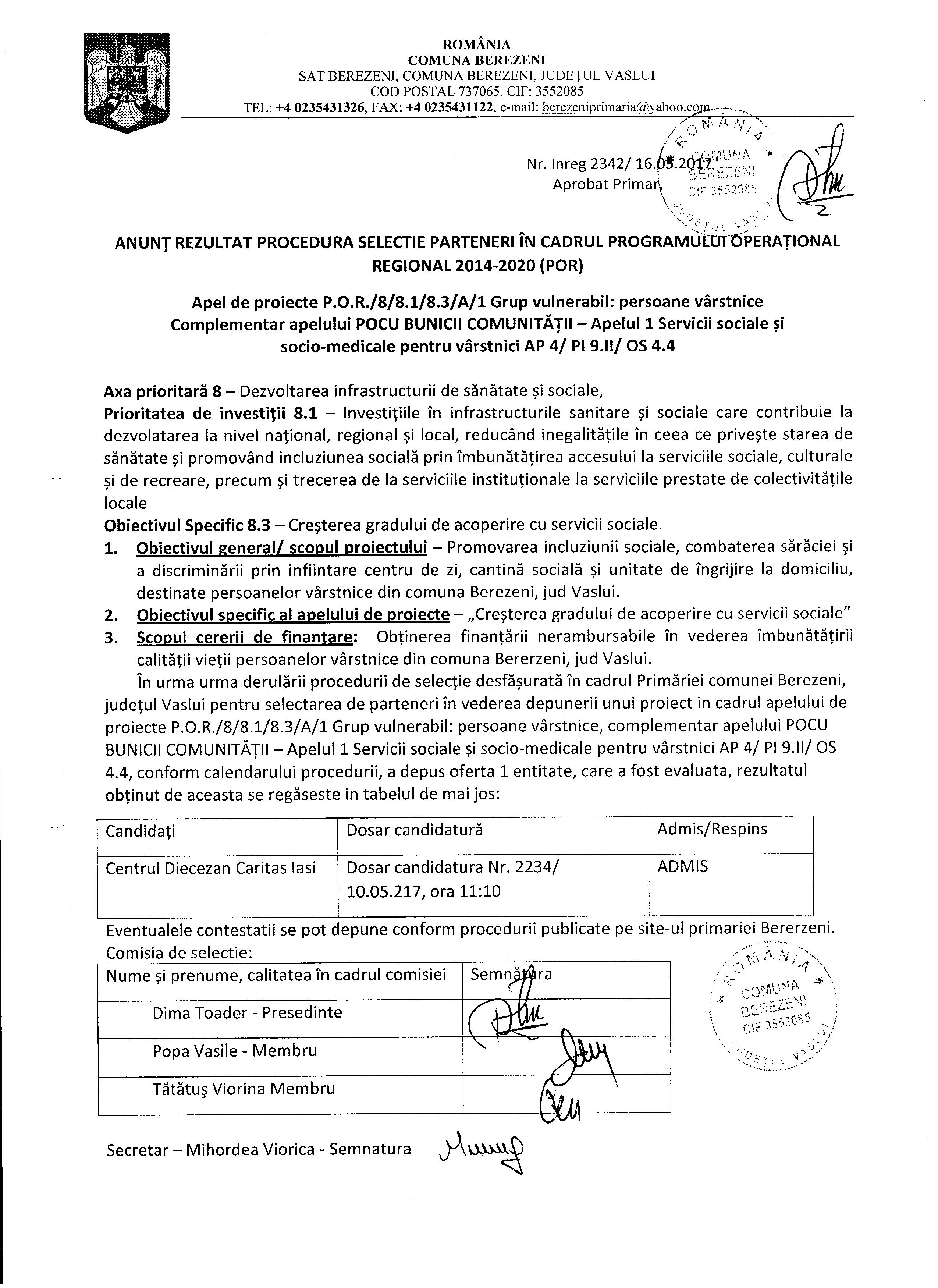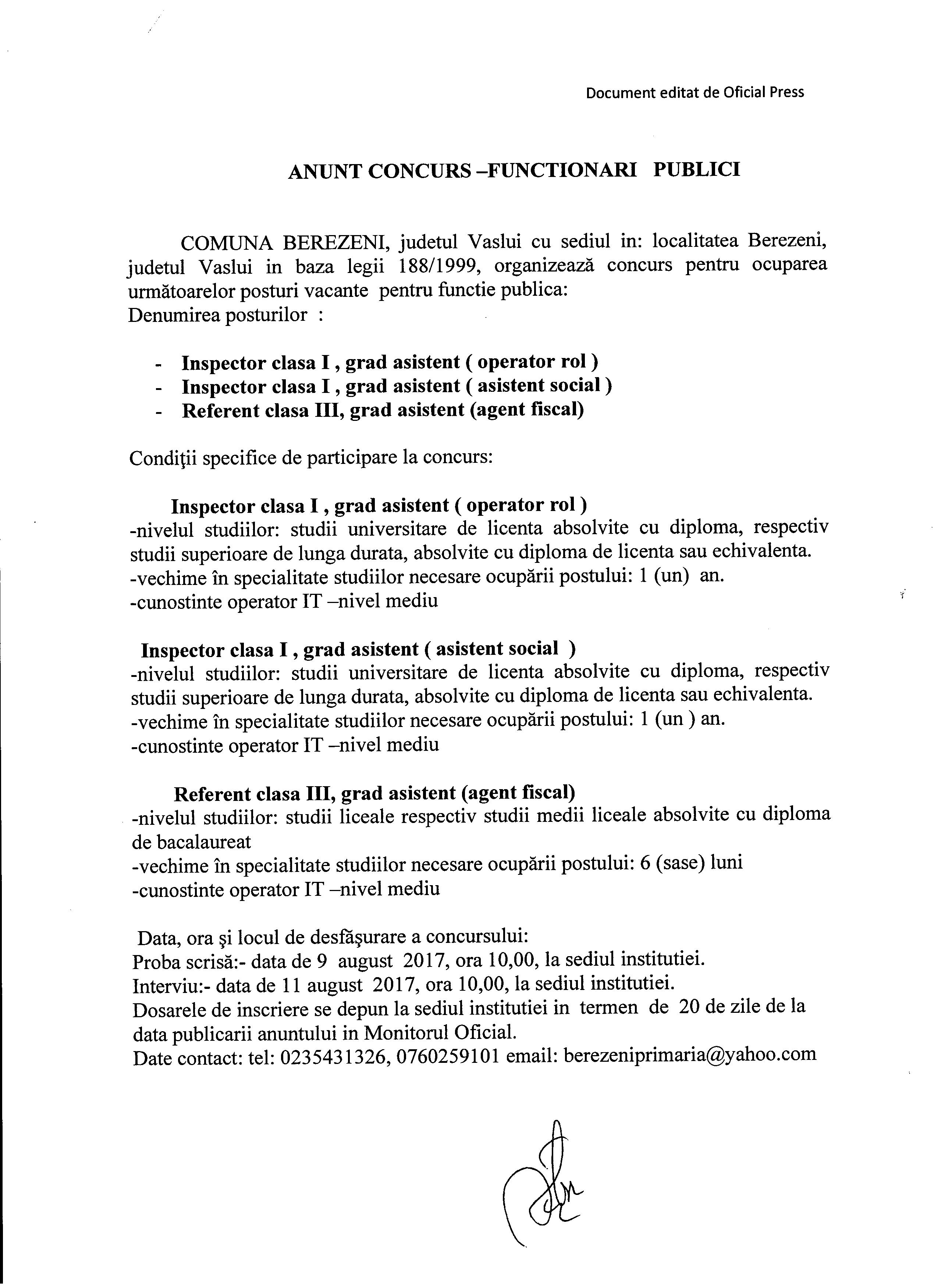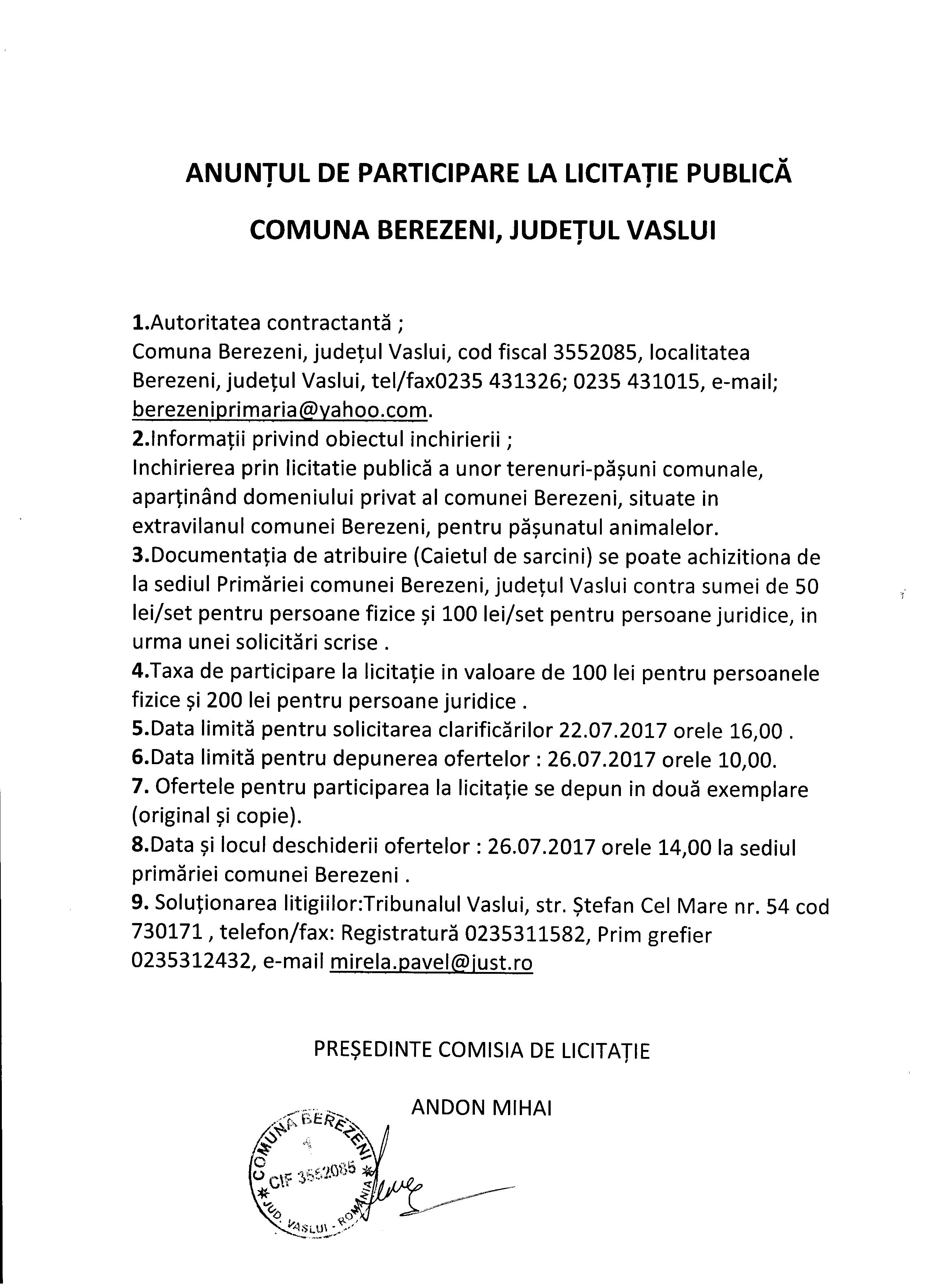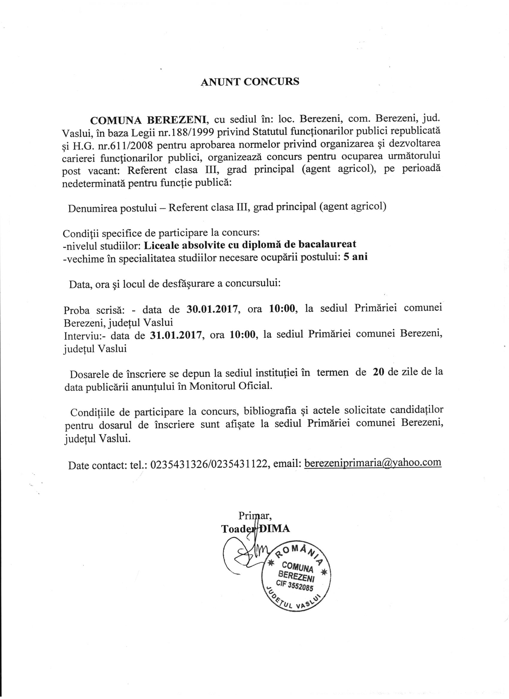 30 iulie 2025 - In Fără categorie By admin Comment off Anunțuri publice Download selected Selectare Toggle Titlu Dată pdf Anunt licitatie ( pdf, 117 KB ) (573 descărcate) 10 nov. 2017 pdf Dezbatare publica varianta stema comuna ( pdf, 248 KB ) (555 descărcate) 07 aug. 2017 pdf Anunt concurs de promovare grad profesional ( pdf, 131 KB ) (651 descărcate) 18 iul. 2017 Imagine Anunt de participare licitatie publica terenuri pasuni ( jpeg, 753 KB ) (685 descărcate) 06 iul. 2017 Imagine Anunt concurs inspector clasa I ( jpeg, 780 KB ) (690 descărcate) 06 iul. 2017 pdf Anunt concurs functionar public ( pdf, 38 KB ) (593 descărcate) 07 iun. 2017 pdf Proiect stema comunei Berezeni ( pdf, 395 KB ) (810 descărcate) 22 mai 2017 Imagine Anunt final rezultate selectie ( jpeg, 1005 KB ) (870 descărcate) 17 mai 2017 Imagine Anunt rezultate selectie parteneri ( jpeg, 1.01 MB ) (812 descărcate) 16 mai 2017 Arhivare Procedura selectie parteneriat ( zip, 5.98 MB ) (1106 descărcate) 28 apr. 2017 Imagine Publicatie de vanzare imobiliara ( jpeg, 1.36 MB ) (697 descărcate) 19 apr. 2017 Imagine Anunt ocupare functie publica agent agricol ( jpg, 277 KB ) (602 descărcate) 30 dec. 2016 pdf Anunt ocupare functie contractuala bibliotecar ( pdf, 502 KB ) (699 descărcate) 14 sept. 2016 pdf Anunt concurs ocupare functie contractuala ( pdf, 514 KB ) (606 descărcate) 07 sept. 2016 pdf Anunt post concurs ( pdf, 184 KB ) (593 descărcate) 05 aug. 2016 pdf Anunt concurs ocupare functie publica ( pdf, 571 KB ) (659 descărcate) 04 mai 2016 pdf Anunt concurs de promovare in grad profesional 2016 ( pdf, 301 KB ) (515 descărcate) 14 mart. 2016 pdf Proces verbal procedura de comunicare ( pdf, 306 KB ) (649 descărcate) 21 dec. 2015 pdf Anunt colectiv ( pdf, 380 KB ) (624 descărcate) 21 dec. 2015 pdf Anexa anunt colectiv ( pdf, 4.10 MB ) (1334 descărcate) 21 dec. 2015 «123456» Next Anunțuri Urbanism
